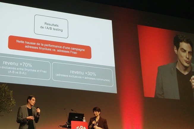 Photo : Camille Berland, en charge du CRM digital à la Fnac et David Bessis, fondateur de tinyclues, le 11 mars lors de leur intervention sur le salon Big Data à Paris.