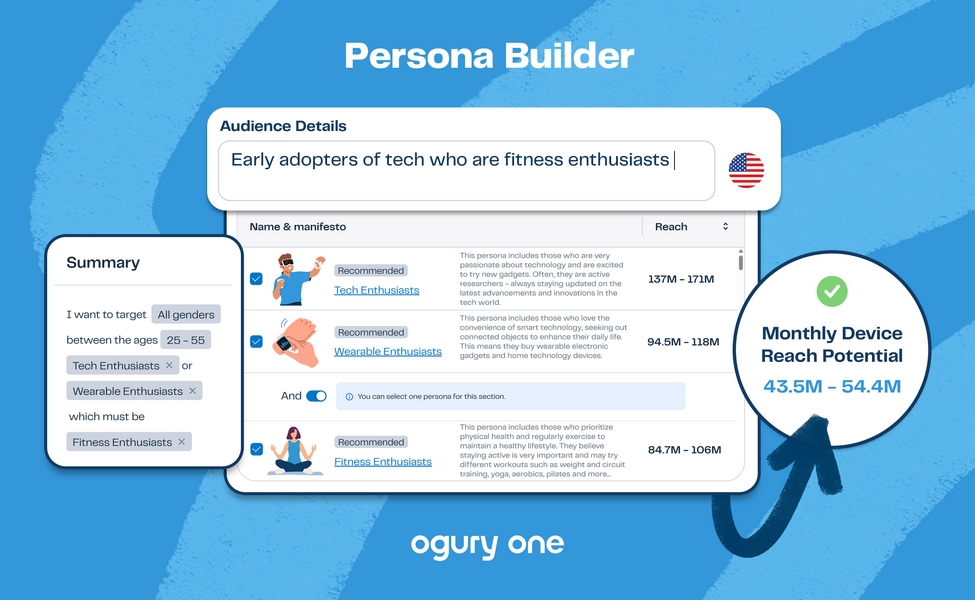 Ogury propose des personas clés en main pouvant être combinés pour créer des audiences sur mesure, à échelle locale et internationale. Les utilisateurs peuvent explorer ces personas à travers des insights détaillés, comme les réponses aux questions d’enquêtes pour les qualifier, leurs intérêts, leurs sites et leurs applications préférés, leurs données démographiques, ou encore les terminaux, heures et zones où leur activité est la plus importante.