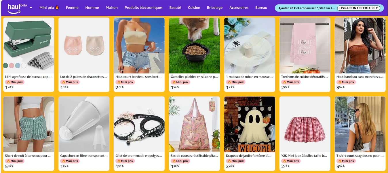 Après son lancement aux Etats-Unis, on découvre l’onglet Haul sur le site d’Amazon en France avec la mention béta. Amazon avait lancé Haul en Amérique en novembre 2024, pour proposer une sélection de produits à 20 $ (17 €) ou moins, afin de contrer les plateformes chinoises Shein et Temu.