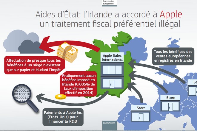 La commissaire européenne fait apparaître que par un système d’affectation artificielle des revenus d’Apple réalisé par l’Irlande, Apple s’est vu appliqué un taux d’imposition effectif sur les sociétés de 1 % sur ses bénéfices européens en 2003, taux qui a diminué jusqu’à 0,005 % en 2014. L’Irlande a ainsi accordé pour 13 milliards d’euros d’avantages fiscaux illégaux à Apple de 1991 à 2015.
