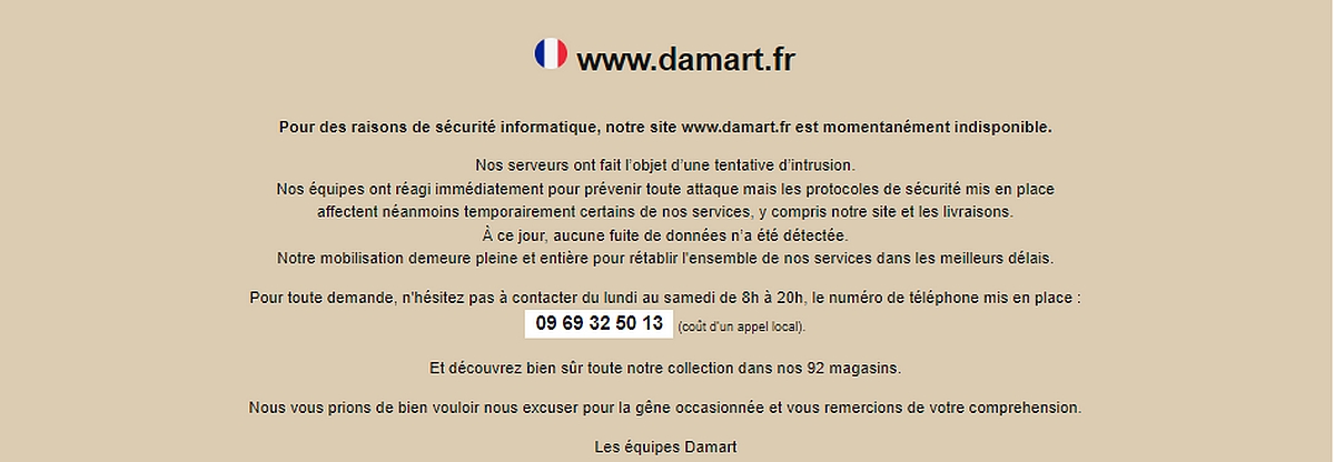 Damart, spécialiste des sous vêtements chauds, est victime d’une attaque informatique. L’attaque a été officialisée le 18 août. Les deux sites web de la marque sont indisponibles (site français et site anglais) Les serveurs informatiques ont fait l’objet d’une tentative d’intrusion, indique l’entreprise.
