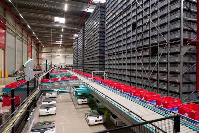 L’installation consiste en des racks de 12 mètres de haut dans lesquels les 37 robots se déplacent de manière autonome dans toutes les directions (à l’horizontal et en vertical) pour extraire les produits de 15 300 bacs. Ils les acheminent ensuite vers l’une des trois stations de préparation, où l’opérateur termine la commande e-commerce du client.