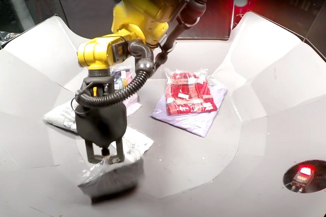 Les robots de Kindred aident à assembler les achats d’articles multiples effectués par les clients. Les vêtements tombent dans le grand bassin de l’une des machines. Un bras robotique sélectionne chaque article par aspiration et prise physique, scanne son code à barres et le place dans un récipient par client. Une fois que tous les articles d’un client sont placés dans le récipient, un employé place le bac sur un convoyeur vers l’emballage et la livraison.