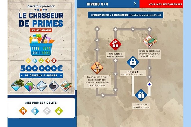 Chez Carrefour, l’objectif était de proposer des cadeaux, des voyages et des bons de réduction aux clients ayant souscrit aux primes de fidélité de l’enseigne organisées en 6 univers : bébé, bio, animalerie, marché, famille et promo. En achetant des produits éligibles aux primes de fidélité préalablement activées via carrefour.fr, chaque participant faisait avancer automatiquement son curseur sur les cases d’un plateau de jeu lui permettant de gagner immédiatement des surprises en atteignant des cases « Instant gagnant » ou de bénéficier de dotations exceptionnelles en participant à des tirages au sort en s’arrêtant sur les cases « Tirage au sort ».