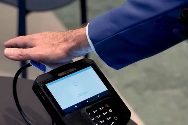 La solution technique est délivrée par Ingenico qui l’a codéveloppée avec Fujitsu. Elle identifie le payeur par les veines de la main. Le but est de fluidifier le passage en caisse. Le client doit au préalable enregistrer la correspondance entre sa carte bancaire et son réseau veineux sur une borne dédiée à cet effet. Amazon propose ce type de paiement sans contact depuis 2020.