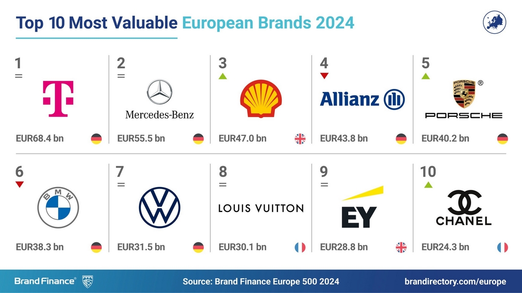 Deutsche Telekom, opérateur télécoms, a une valeur de marque en hausse de 13% à 68.4 milliards d’euros. C’est la marque européenne la plus valorisée au monde pour la deuxième année consécutive. Mercedes-Benz a une valeur de marque de 55,5 milliards d’euros et occupe le deuxième rang.