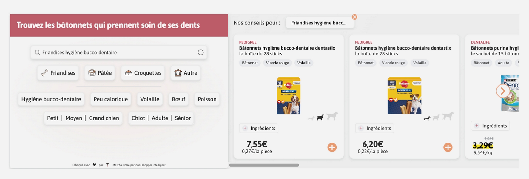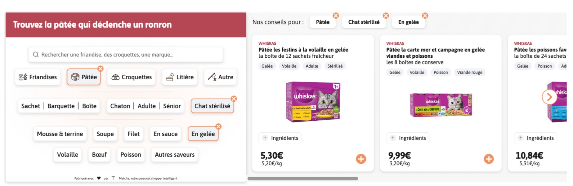 Matcha intervient sur les capacités techniques (IA, UX/UI…) et la compréhension des comportements des shoppers du Drive et de leurs habitudes de consommation spécifiques. Mars Petcare porte la voix du client et celle des shoppers Drive au cœur du projet, et pour développer une solution catégorielle qui répond aux enjeux business de cette catégorie de produits.