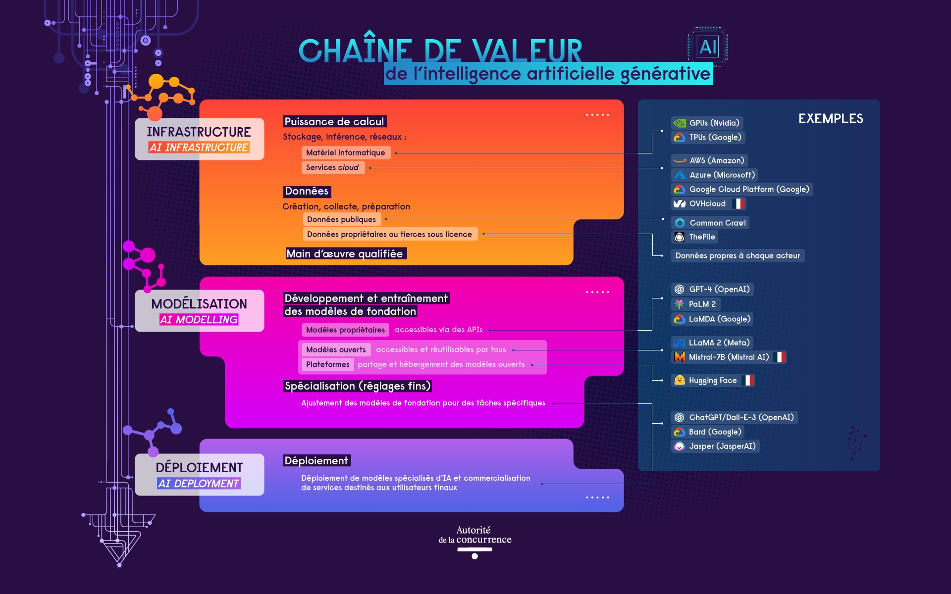 L’Autorité de la concurrence s’inquiète de la structuration actuelle du marché de l’IA générative en France autour de quelques fournisseurs américains (Microsoft, AWS, Google) déjà bien implantés dans le domaine du Cloud.