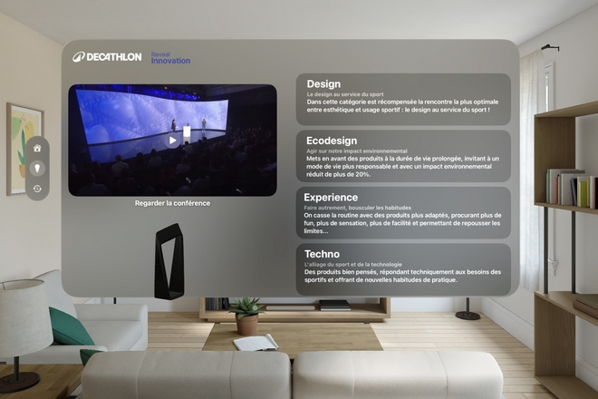 La première application simplement nommée Decathlon est disponible dans l’espace Shopping d’Apple Vision Pro en France, en Allemagne et au Royaume-Uni. Elle permet aux utilisateurs de parcourir le catalogue en ligne de Decathlon et d’acheter les articles adaptés pour leurs aventures sportives.