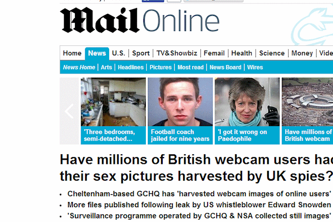 Le quotidien britannique Daily Mail interroge à sa une du 27 févier : “des millions de citoyens ont-ils eu leurs photos sexuelles être espionnées lors de séances de Webcam par des espions britanniques ?” Le journal cite les informations issues de nouvelles révélations de Edward Snowden, le transfuge de la NSA et publiées chez son confrère Le Guardian, autre quotidien britannique.