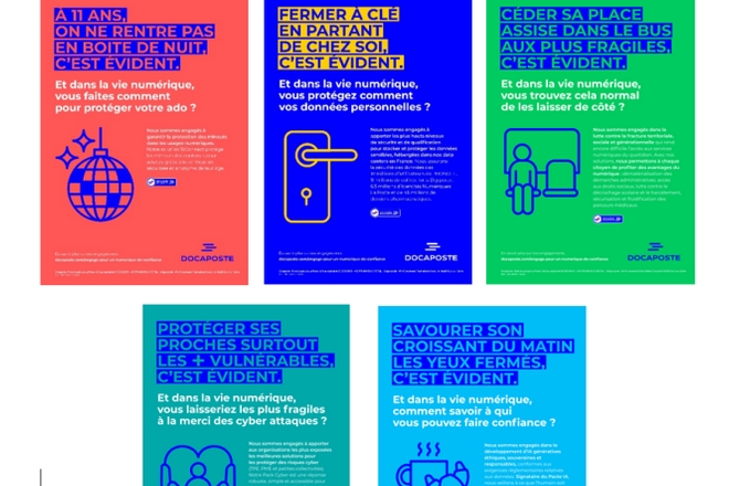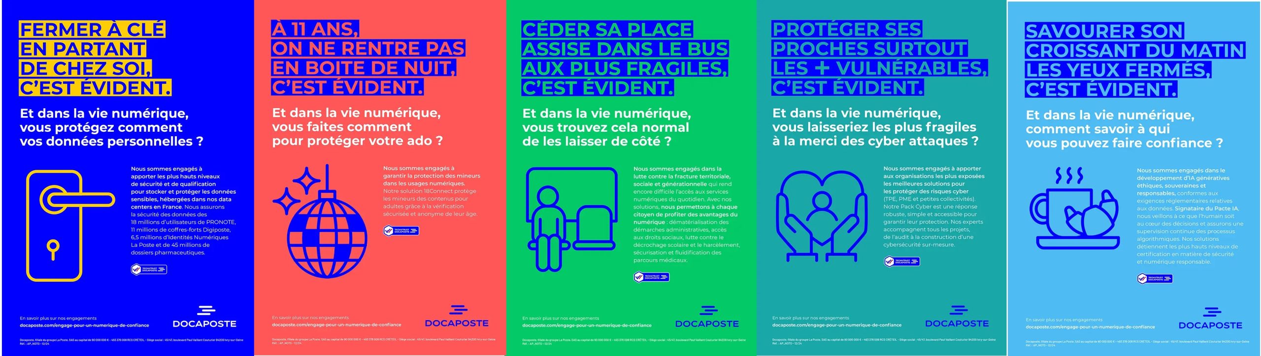 La campagne comprend cinq annonces présentant les convictions de La Poste pour un numérique responsable éthique et souverain. Elle vise à conforter la notoriété de Docaposte auprès des décideurs des grandes entreprises, de la banque-finance-assurance, de la santé et des acteurs du secteur public, notamment l’État et les institutionnels.