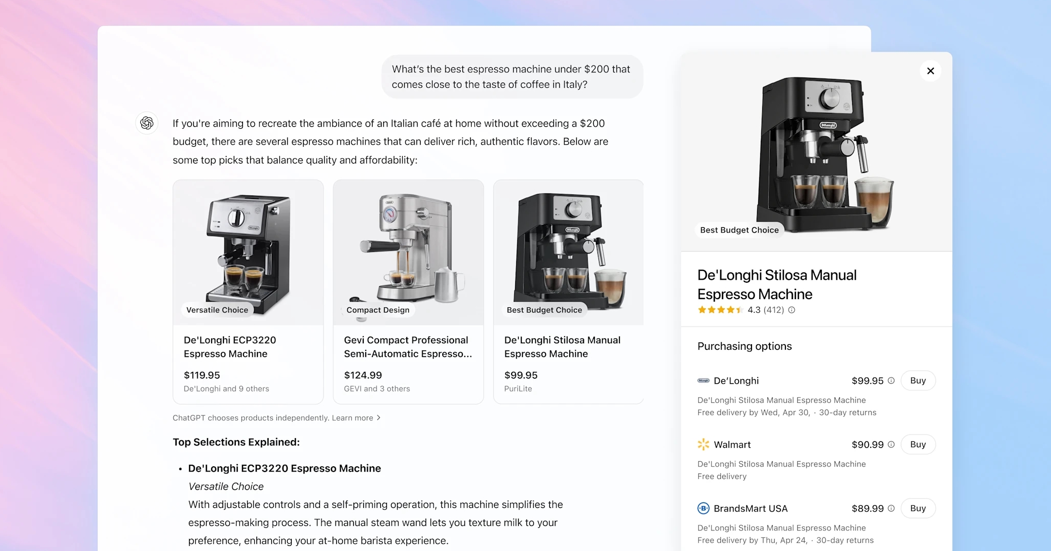 Un exemple donné par OpenAI concerne par exemple les « machines à espresso à moins de 200 $ les plus proches d’un café en Italie ». ChatGPT affiche une sélection de produits. En cliquant, une barre latérale présente des informations supplémentaires telles que les avis d’utilisateurs provenant de sites comme Amazon ou Reddit, ainsi que des liens directs vers les sites marchands pour effectuer l’achat.