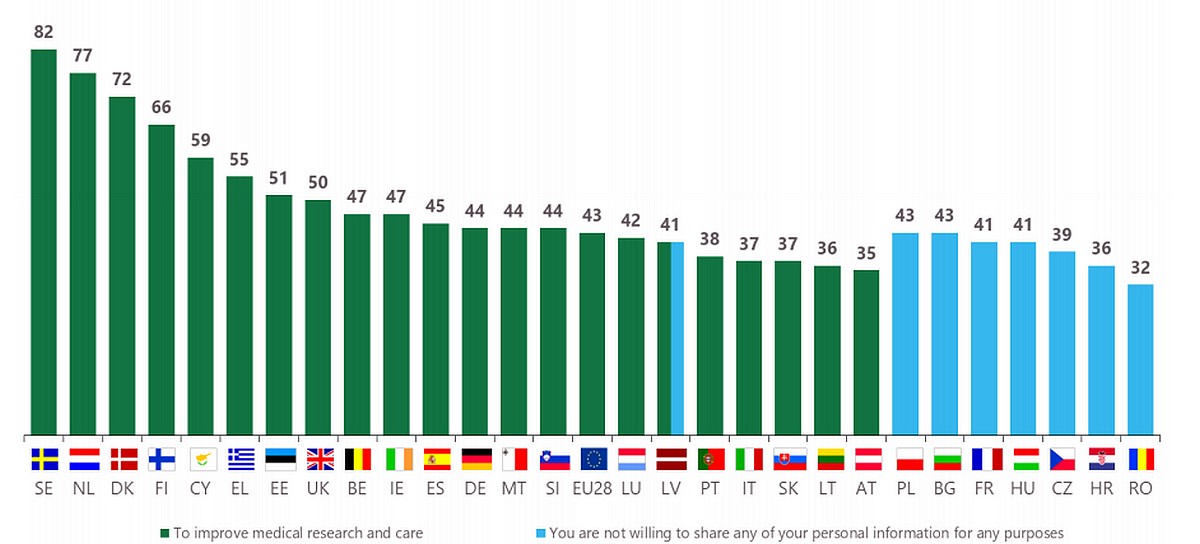 Quand il s’agit d’améliorer soit la recherche et les soins médicaux, soit la réponse à une situation de crise telle qu’une épidémie, une catastrophe ou une attaque terroriste, la moyenne des Européens est d’accord pour communiquer une partie de ses données personnelles respectivement à 42% et 31%.