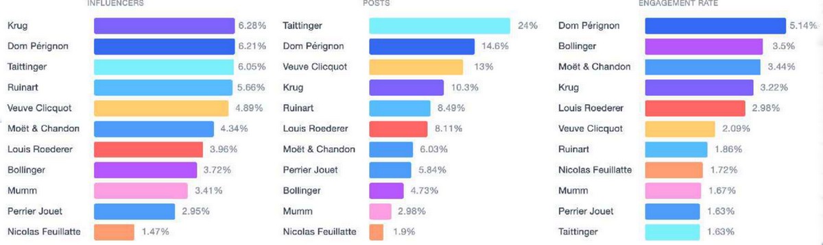 Comparativement les chiffres sont nettement plus élevés pour le Champagne. La marque Krug est celle qui a le plus d’influenceurs la mentionnant (6,28%), suivie de près par Dom Pérignon qui est également le leader en matière de taux d’engagement (5,14%). Taittinger possède le plus de mentions (24%), mais son taux d’engagement est le plus faible (1,63%).