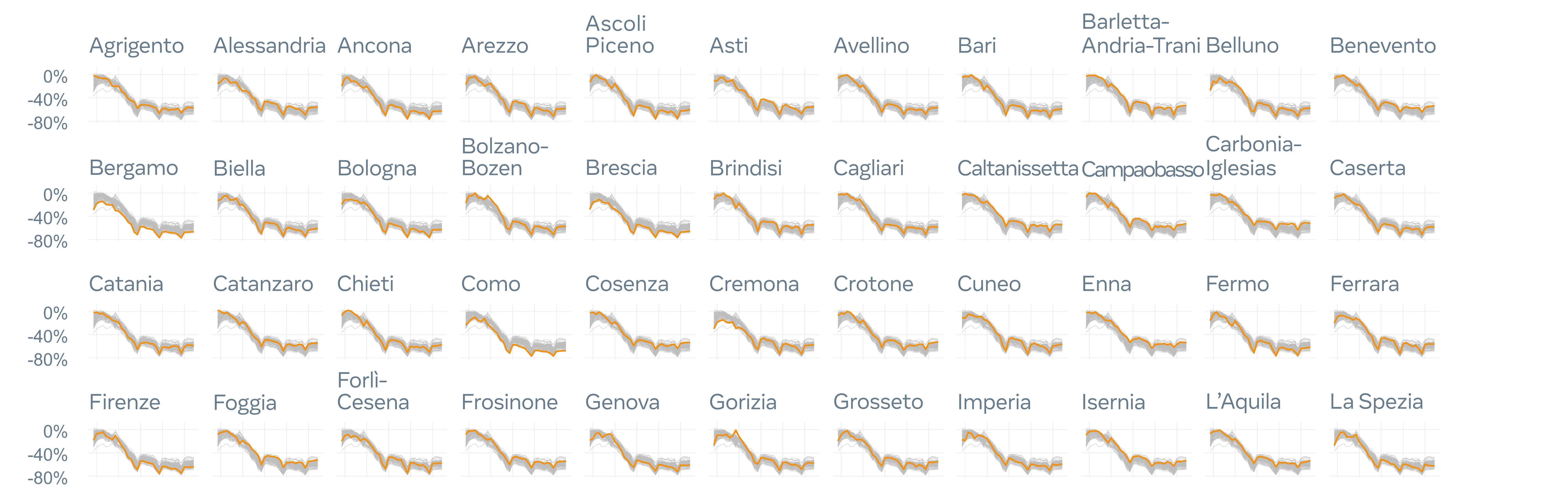 Autre carte, les tendances de l’amplitude des mouvements montrent au niveau régional si les gens restent près de chez eux ou si ils visitent de nombreux quartiers de la ville, ce qui peut donner un aperçu de l’orientation des mesures préventives dans la bonne direction. Les tendances de l’amplitude des mouvements, comme celles d’Italie montrent si les habitants de différentes régions visitent de nombreuses régions.
