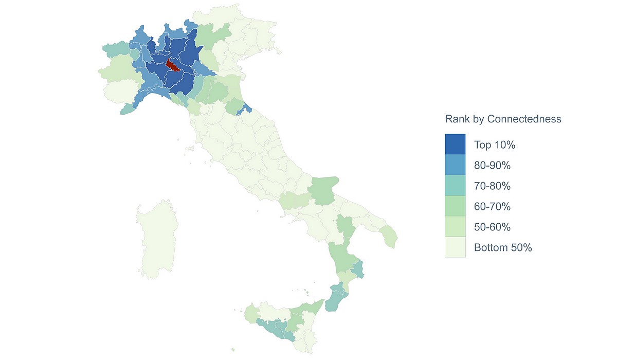 Par exemple, cette carte montre comment les parties de l’Italie ont connectées à la Lombardie sur Facebook, révélant comment les liens sociaux peuvent aider les communautés à combattre et à se remettre de la crise.