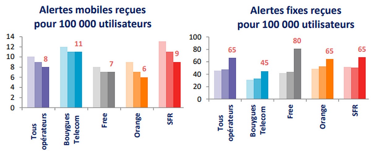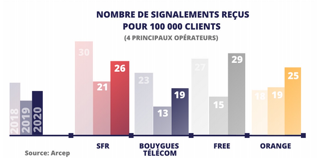 Il faut toutefois souligner que selon un sondage Ifop mené en parallèle à la demande de l’Arcep, c’est en fait SFR qui récolte les moins bonnes notes en matière de satisfaction client. Sur la plateforme « J’alerte l’Arcep », les alertes concernant les opérateurs fixes ont fortement augmenté en 2020 dans un contexte de crise sanitaire et d’accroissement du télétravail. Les alertes concernant les opérateurs mobiles ont, en volume, légèrement diminué. En 2020, les signalements relatifs à l’internet fixe ont été particulièrement prépondérants en particulier pour Free.