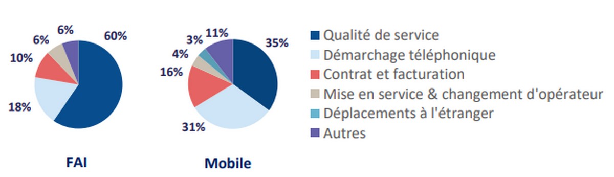 Les signalements reçus concernent le plus fréquemment la qualité de service, y compris le service après-vente. Vient ensuite l’insatisfaction quant aux évolutions des réseaux en particulier sur le déploiement de la fibre optique mais aussi sur la couverture mobile insuffisante, etc. Ces signalements sont suivis par les critiques sur les pratiques commerciales des opérateurs et les difficultés rencontrées lors d’un changement d’opérateur. La qualité de service et les attentes liées à l’évolution des réseaux fixes sont particulièrement prédominantes. Pour le mobile, les pratiques commerciales des opérateurs et le changement d’opérateur sont davantage présentes.