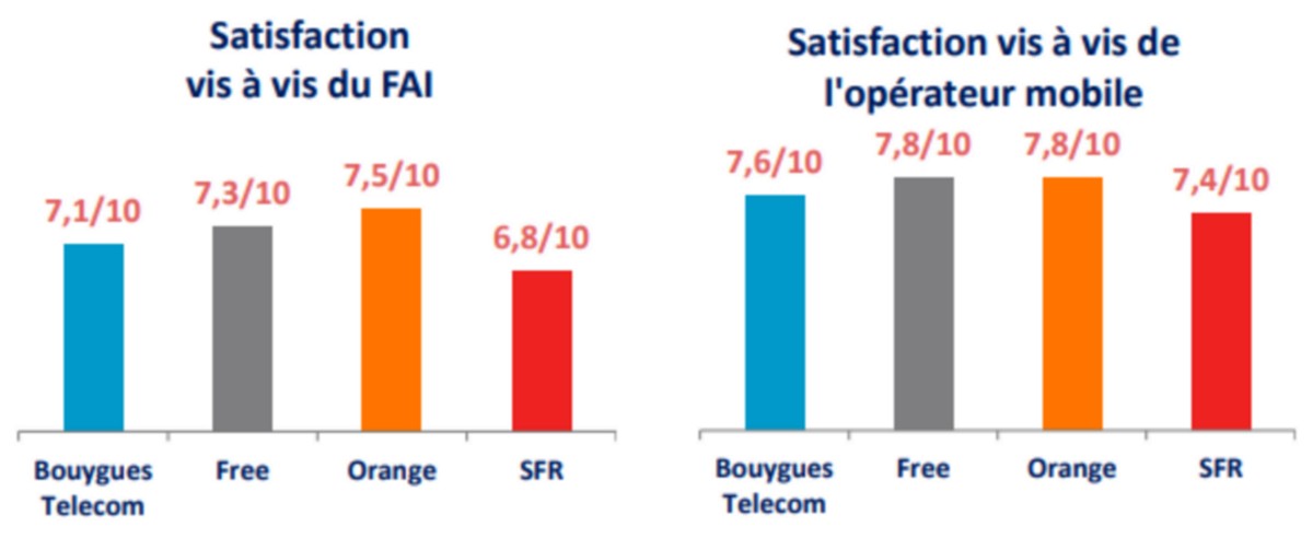 Les notes du sondage réalisé par l’Ifop traduisent une légère baisse dans la satisfaction des consommateurs vis-à-vis de leur fournisseur d’accès à internet (FAI) et de leur opérateur mobile. Le classement des opérateurs n’a pas changé d’une année sur l’autre ni pour les FAI ni pour les opérateurs mobiles. Côté FAI, c’est Orange qui obtient la meilleure note de satisfaction. Côté mobile, c’est également Orange qui est le mieux noté mais cette fois-ci, il est à égalité avec Free. Le moins bien noté est SFR tant pour les services fixes que pour les services mobiles. La note moyenne est passée de 7,65 en 2019 à 7,5 en 2020.