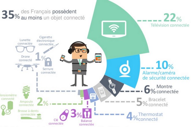 Au global, un Français sur trois possède au moins déjà un objet connecté. Etonnamment, c’est la TV qui est citée en tête, suivie par la caméra ou l’alarme de sécurité connectée. La montre connectée n’arrive qu’en 3ème position et ne concerne que 6% des Français. Le bracelet de santé connecté touche pour sa part 5% des Français. La balance connectée est chez à peine 3% des Français. Withings a un boulevard devant lui !
