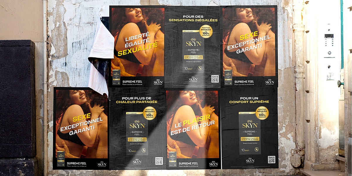 Skyn développe une approche provocante et une prise de parole pensée pour accompagner le lancement de Skyn Supreme Feel, un préservatif en polyisoprène le plus fin au monde. Skyn est plutôt sûr de son nouveau produit et annonce un « Plaisir garanti ou remboursé ».