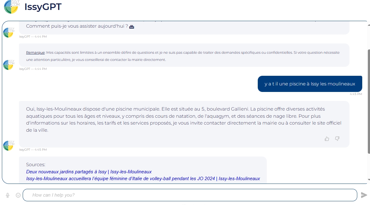 IssyGPT est conçu pour délivrer une assistance immédiate. Il répond aux questions des citoyens 24/7. IssyGPT répond sur les horaires des services municipaux, les démarches administratives, ou les événements locaux, pour faciliter la vie quotidienne des habitants.