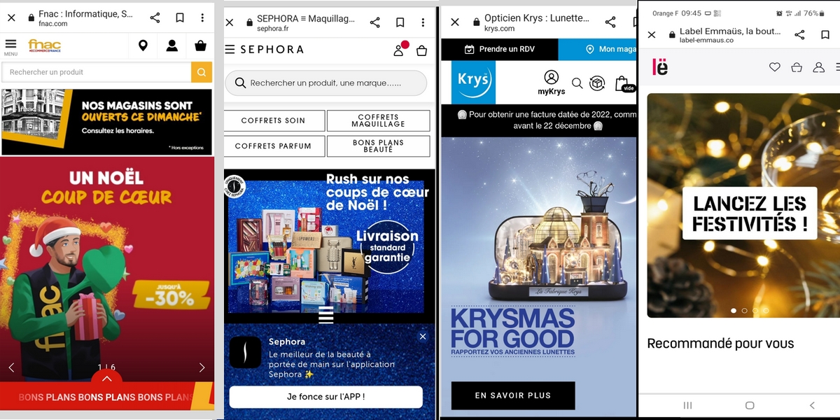 En revanche et heureusement, on observe des fenêtres de chabots moins envahissantes ou intervenant de manière plus cohérente en cours des parcours d’achat les plus avancés. Il reste à souligner que la page d’accueil des sites mobiles, qui est un des accès à l’offre de fin d’année des commerçants que les achats soient finalisés en magasin ou en ligne est plutôt convaincante avec des pratiques très diverses d’un circuit à l’autre.
