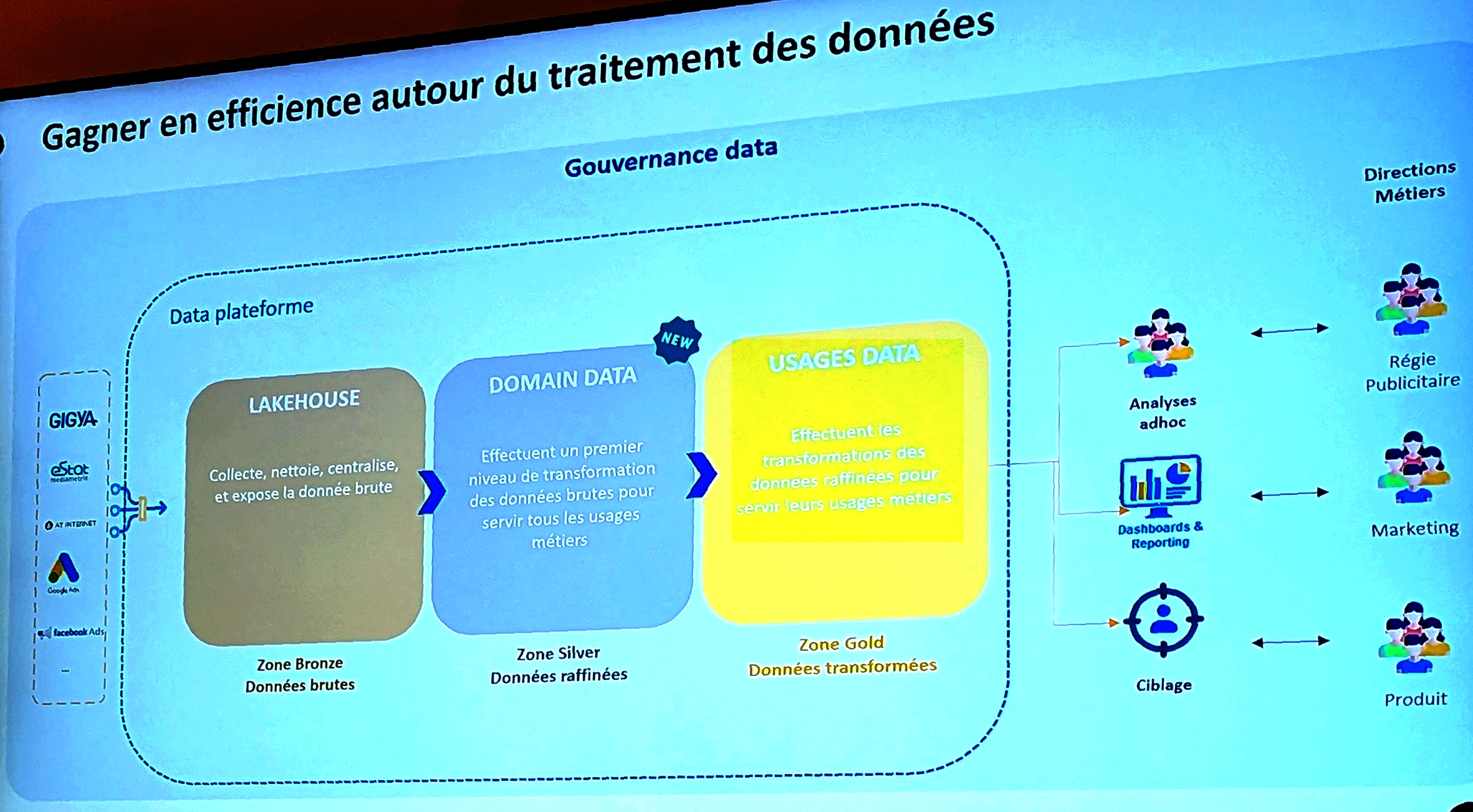 France Télévisions s’aligne sur « l’architecture en médaillon ». Celle-ci est très en vogue actuellement dans les directions Data, avec une architecture à 3 niveaux Bronze / Silver / Gold. L’équipe Data intervient sur la zone Bronze. Elle travaille sur les ingestions des données brutes dans le Lake House. Les données passent ensuite sous le contrôle des équipes Data Domain qui assurent un premier niveau de transformation dans la zone Silver.