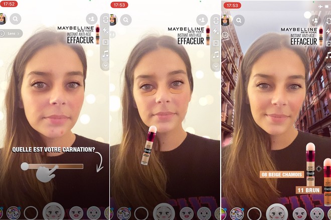 La marque Maybelline New York, propriété du groupe L’Oréal, propose l’essai virtuel de fond de teint grâce à la technologie de réalité augmentée de Snapchat. Que l’on soit dans sa salle de bain ou en magasin, un filtre – une Face Lens -, créé spécialement pour le produit Instant Anti Âge L’Effaceur, commercialisé en France depuis 2020, donne la possibilité à son utilisatrice de trouver la teinte se rapprochant le plus de sa carnation, son sous-ton, quel que soit l’effet désiré.