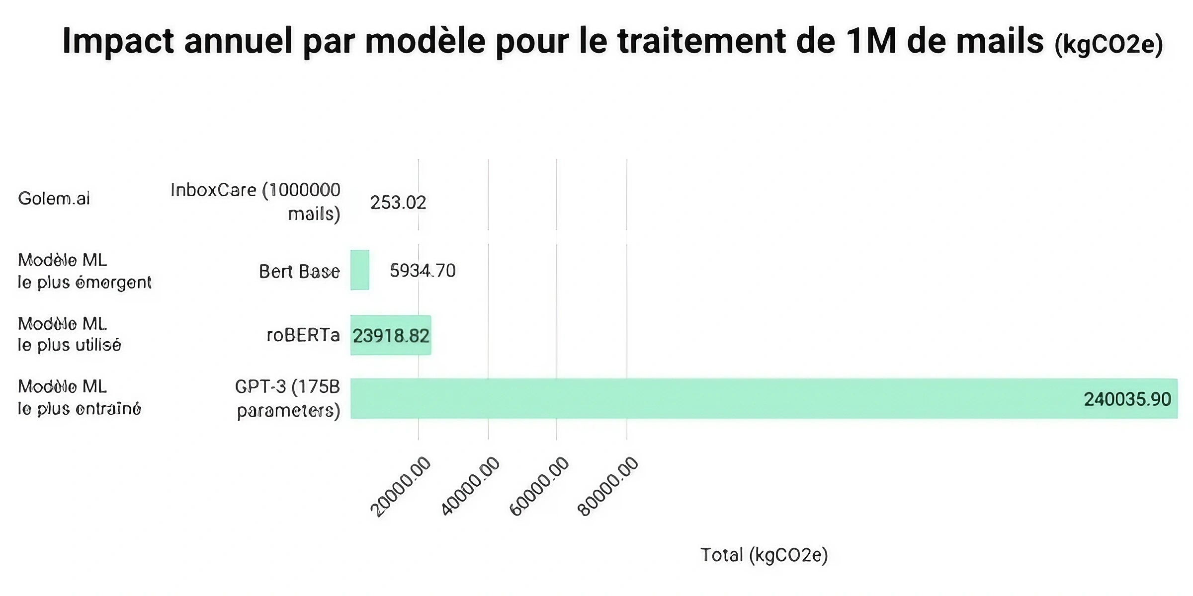 Golem.AI se positionne comme une intelligence artificielle d’analyse du langage frugale. Afin d’effectuer l’analyse d’impact, Greenly a créé un scénario portant sur le traitement mensuel de 1 million de mails et de pièces jointes. L’objectif était de connaître l’impact carbone lié à l’utilisation de différentes technologies de reconnaissance du langage. Il s’agit de Inboxcare employé par Golem.ai, roBERTa et GPT-3.