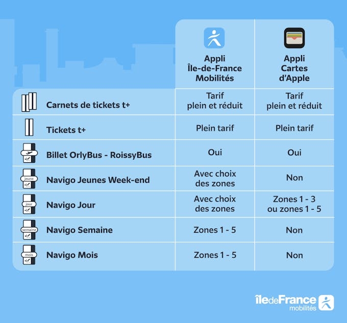 Pour charger les titres dans un iPhone ou dans une Watch, l’utilisateur doit disposer à minima d’un iPhone XS ou XR ou iPhone SE 2 avec à minima iOS 17.5 et la version 8.1 de l’app Île-de-France Mobilités et à partir d’un modèle Watch Série 6 ou Watch SE 2 avec à minima la version WatchOS 10.5.