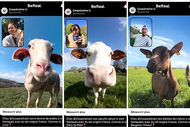 Trois créations ont été imaginées par l’agence moonlike du groupe Australie.Gad. Elles ont ciblé les 25-49 ans qui représentent 32% de l’audience active de BeReal en France. La thématique était celle des produits laitiers. L’étude de notoriété lancée après le dispositif a montré une augmentation de +7% d’intention d’achat sur les produits laitiers de Coopérative U.