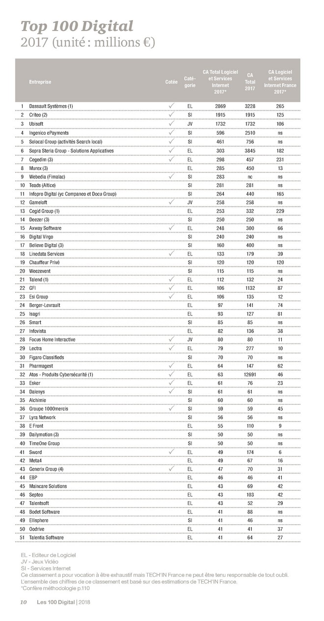 Pour autant, seulement 3 acteurs hexagonaux dépassent le milliard d’euros de chiffre d’affaires et figurent dans la cour des grands au niveau international. Il s’agit de l’inusable Dassault Systèmes, grâce à ses logiciels de création graphique, suivi par Criteo, pour ses solutions de publicité digitale et d’Ubisoft, leader du jeu vidéo.