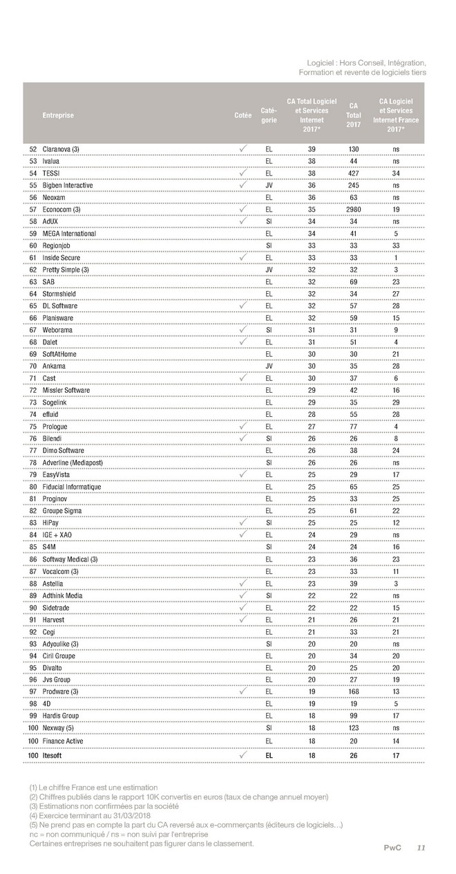 PwC établit également un classement des 100 premiers éditeurs français de logiciels. La croissance de ce secteur est 8.3 %,soit une accélération de près de 2 points par rapport à 2016. 64 de ces éditeurs sont présents dans le Top 100 Digital. Dassault Systèmes se classe 1er, Sopra Steria Group 6ème, Cegedim 7ème, Murex et Cegid ferment la marche du Top 5 Logiciel.