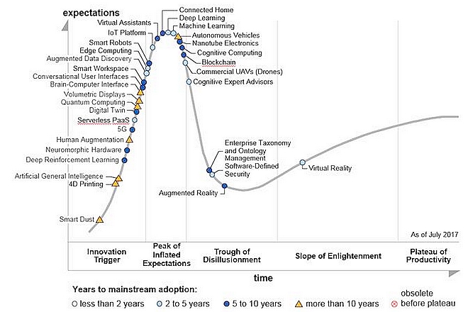 Dans le détail, les technologies de l’intelligence artificielle seront multiples. Gartner cite bien sûr le Machine Learning et le Deep Learning. Ces technologies sont au top des attentes des entreprises actuellement selon la courbe de Gartner mais il faudra attendre encore 2 à 5 ans avant qu’elles ne délivrent toute leur valeur.