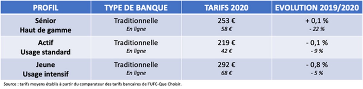 Selon l’UFC, les tarifs des banques traditionnelles connaissent une baisse tout juste symbolique en 2020, de -0,3% alors que les banques en ligne réduisent leurs tarifs de 12%. La baisse de -0,3% est loin de compenser la croissance des tarifs bancaires depuis 2009 près de 25% supérieure à l’inflation souligne l’UFC.