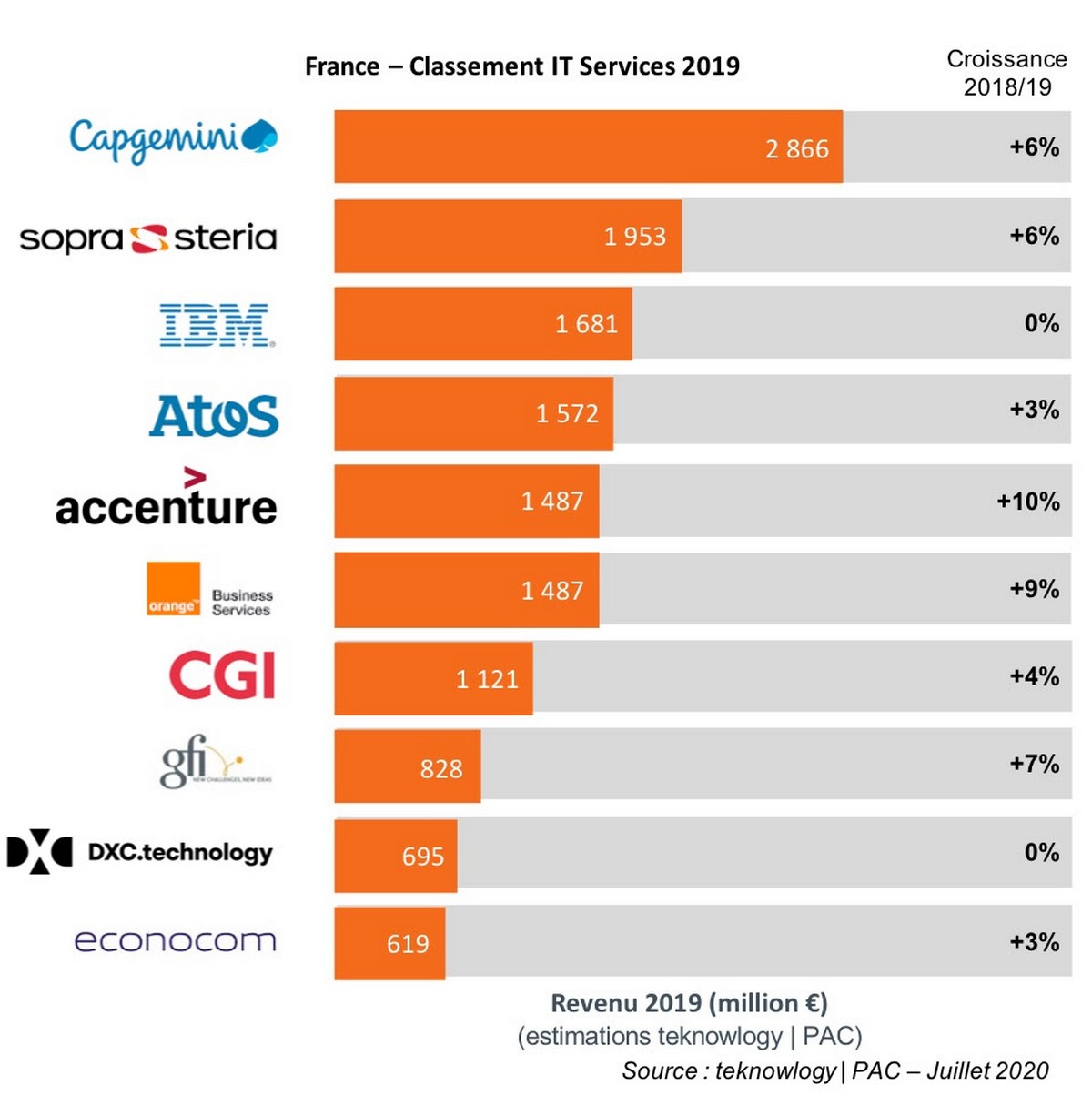 Dans le détail de 2019, Cap Gemini est arrivé en tête et de loin en termes de chiffres d’affaires avec 2,9 milliards d’euros. Il était suivi par Sopra Steria avec 1,9 milliard d’euros et IBM avec 1,7 milliard d’euros. Teknowlogy relève toutefois qu’IBM et DXC ont vécu une année 2019 plutôt stable, ce qui n’est pas une bonne performance.