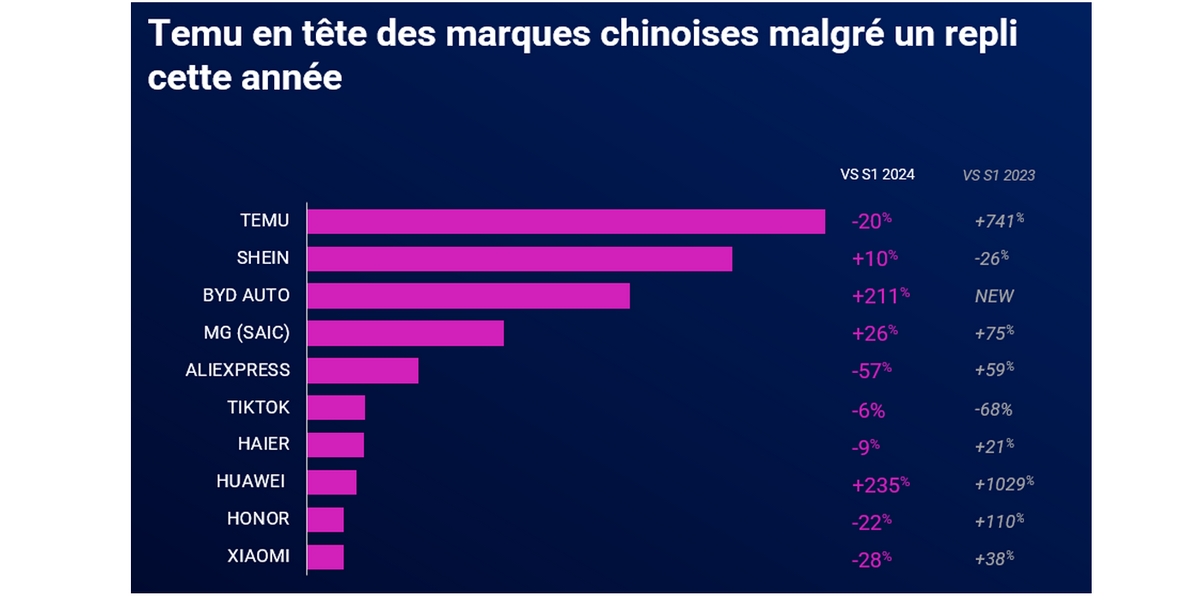 Shein (Ultra Fast Fashion), Aliexpress (Place de marché), Haier (groupe chinois d’électroménager et d’électronique grand public), Huawei (smartphones), Honor (électronique grand public smartphones et PC portables) et TikTok complètent le tableau avec des trajectoires plus contrastées, reflet d’un marché en perpétuelle recomposition.