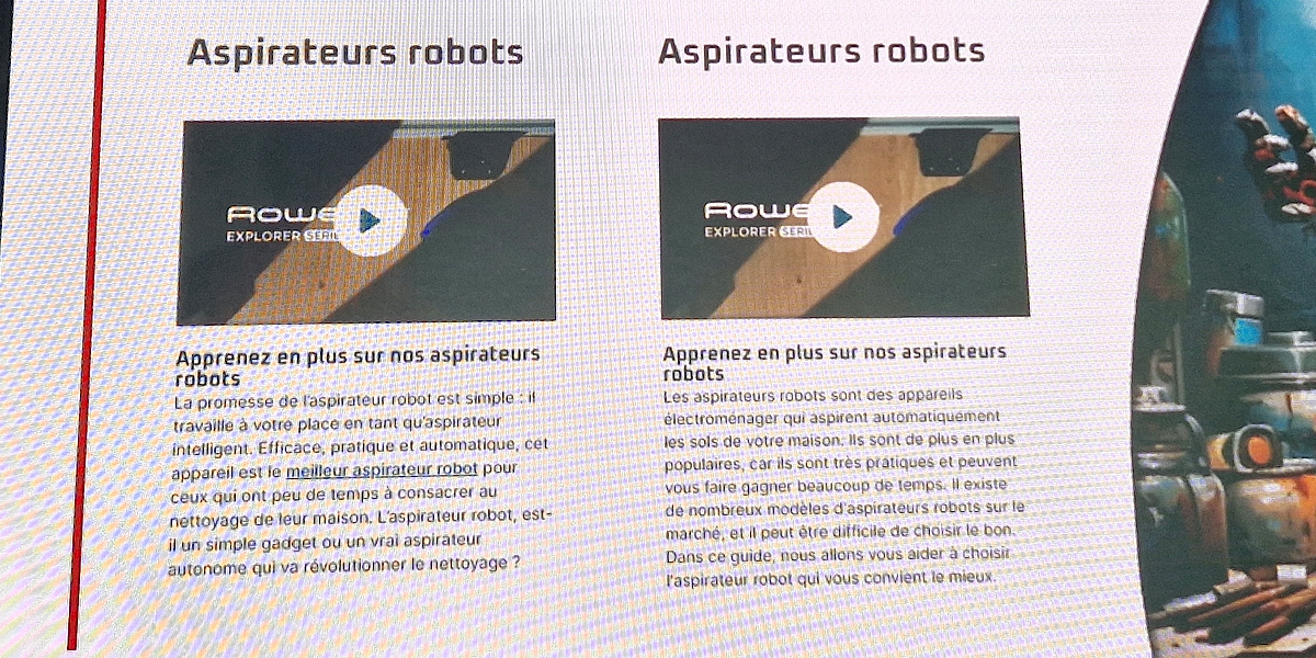 Côté organisation, il y a enfin la nécessité de piloter ces stratégies de contenu, selon les sites en central ou depuis les marchés locaux. Seb travaille avec Converteo pour trouver des solutions sur ces points grâce à l’IA générative. Ce test est en cours sur le site Rowenta.fr où Seb a identifié un certain nombre de pages catégorielles, de pages listing produits à optimiser.