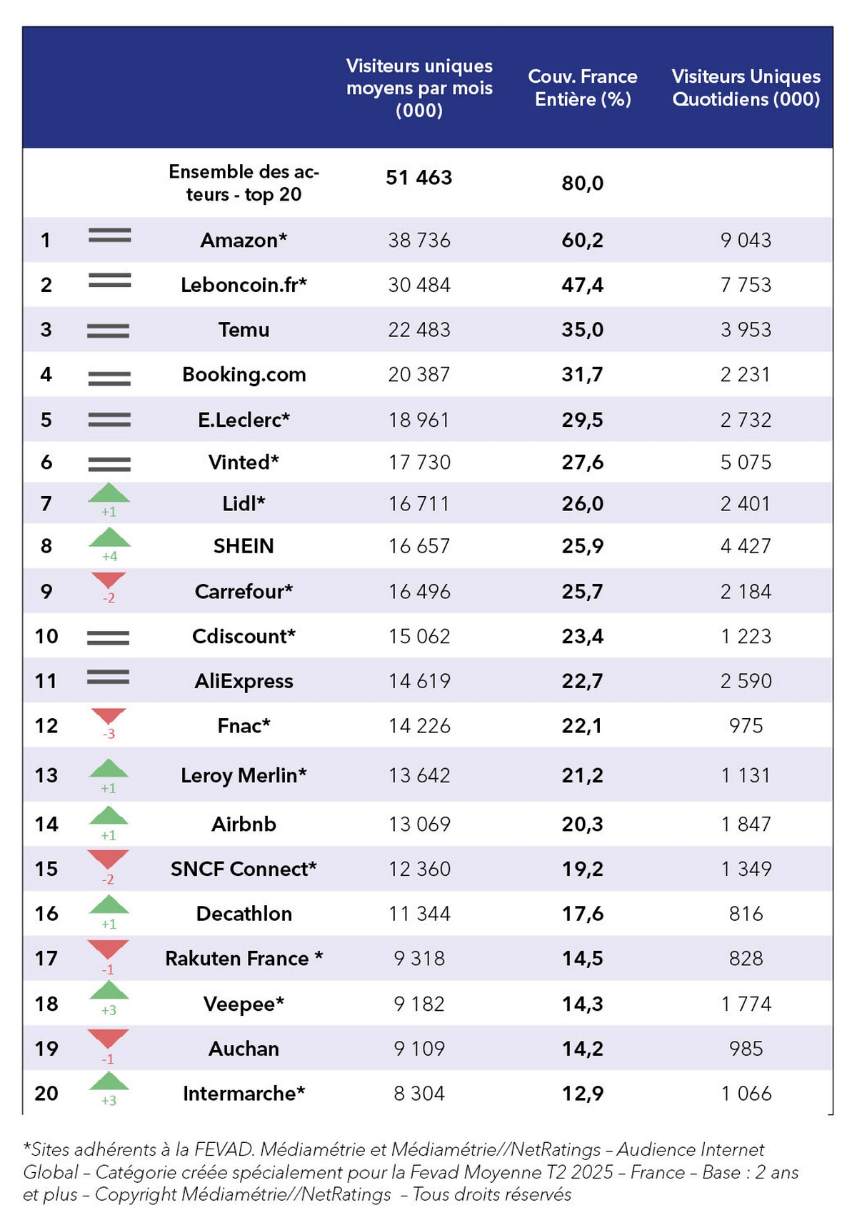 Les six sites e-commerce les plus importants en audience en France conservent leurs positions. Amazon, Leboncoin, Temu, Booking, E.Leclerc et Vinted restent comme au 1er trimestre 2025 les six premiers du classement. C’est ce que montre le classement des audiences du e-commerce du 2ème trimestre 2025 établi par la Fevad avec Médiametrie//NetRatings.