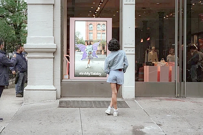 L’écran est placé dans la vitrine de la boutique de Coach à New York dans le quartier de Soho. Il a été développé avec la société Zero10. Alors que les gens passent, l’écran les attire avec un reflet d’eux tenant différentes versions du sac le plus vendu de la marque Coach, le Tabby . L’écran affiche une vidéo de la personne en temps réel, puis superpose sur cette vidéo le modèle 3D d’un sac à main, soit attaché sur l’épaule soit serré dans la paume de la main.