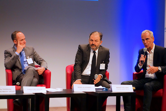 Photo, de gauche à droite, Christoph Keese, du groupe de presse allemand Axel Springer, Denis Olivennes président du Directoire de Lagardère Active et Benoit Sillard, DG de CCM Benchmark Group le 15 Mai à la Cité Universitaire à Paris.