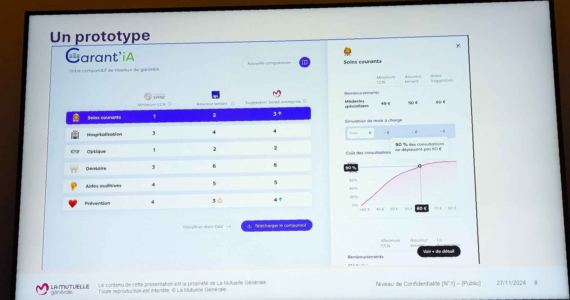Les commerciaux chargés de commercialiser ces complémentaires santé doivent faire la différence auprès des DRH. Or, l’intelligence artificielle s’avère un précieux allié pour déchiffrer les tableaux de garantie santé des concurrents. « Une entreprise démarchée par un commercial est déjà assurée. Le commercial doit être différenciant et l’avantage compétitif n’est pas uniquement dans le prix, mais aussi sur les garanties offertes » résume Magalie Didier, responsable des Produits Data & IA au service de l’efficacité opérationnelle & de la performance commerciale de la Mutuelle Générale.