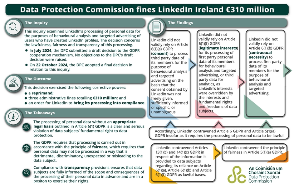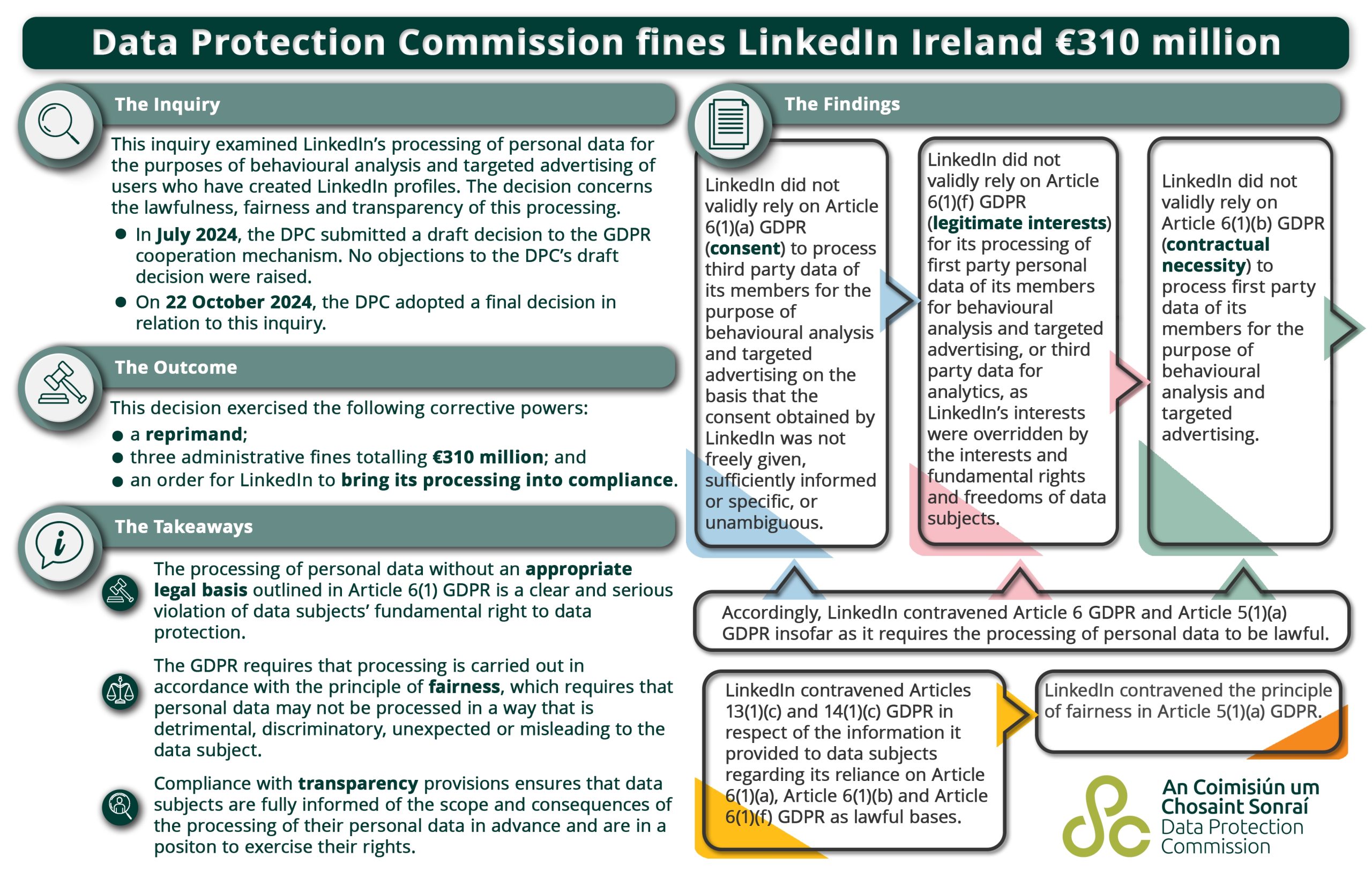 Le RGPD n’a pas été respecté. LinkedIn n’a pas valablement invoqué l’article 6(1)(a) du RGPD (sur le consentement) pour traiter les données de tiers de ses membres à des fins d’analyse comportementale et de publicité ciblée au motif que le consentement obtenu par LinkedIn n’était pas donné librement, suffisamment éclairé ou spécifique, ou sans ambiguïté.