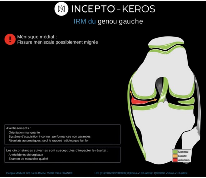 Cette application est une première pour Incepto qui jusqu’alors mettait à disposition des hôpitaux et centres médicaux des intelligences artificielles médicales via sa plateforme Folio. L’intelligence artificielle développée par Incepto est conçue pour détecter automatiquement les lésions des ligaments, des ménisques et des cartilages. Pour cela, elle emploie 30 algorithmes différents réalisant des tâches telles que la localisation des structures, l’aide au diagnostic, la détection du protocole d’acquisition et des artefacts métalliques, etc. Les algorithmes ont été entraînés sur une base de 25 000 IRMs, multicentrique et multi-machine.