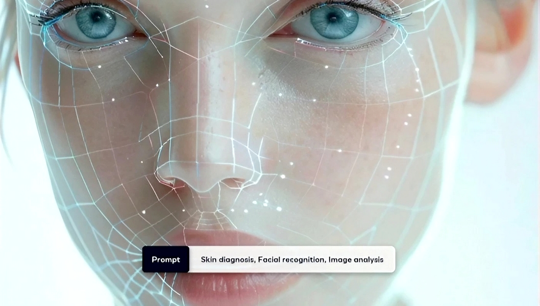 La deuxième image est une “beauty tech” image. Elle offre des services et du soin dermatologique. Le prompt ici est « skin diagnosis, facial recognition, image analysis » (« diagnostic de peau, reconnaissance faciale, analyse d’images »).