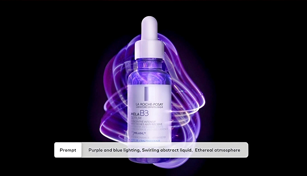 Quant à la troisième image, il s’agit de l’image d’un produit. Il s’agit de la représentation abstraite d’un ingrédient actif Melasyl de La Roche Posay. Le prompt donné ici est « purple and blue lighting, swirling abstract liquid, and etheral atmosphere ». (« Éclairage violet et bleu, liquide abstrait tourbillonnant et atmosphère éthérée »).