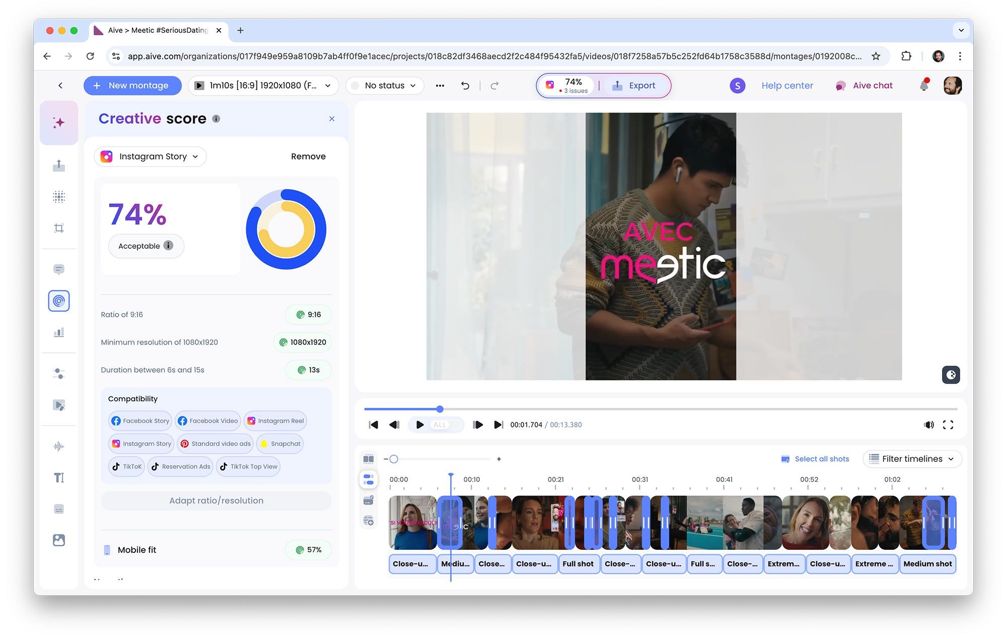 En quelques secondes, Aive adapte les vidéos pour chaque réseau social, que ce soit un format vertical de 15 secondes pour TikTok ou un contenu optimisé pour Meta (Instagram et Facebook) ou Pinterest. Aive intègre un « Score Créatif » qui évalue et optimise la performance des vidéos, afin de cibler une meilleure efficacité sur chaque plateforme sociale tout en respectant les spécificités de chaque réseau.