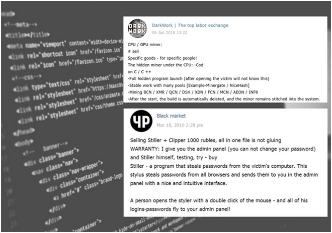 Des utilisateurs novices peuvent également trouver des messages faisant la promotion d’outils furtifs d’extraction de crypto-monnaie qui s’exécutent à l’insu des victimes en échange de 600 roubles, ou encore des outils de vol d’informations qui recueillent des documents, des captures d’écran et des mots de passe en échange de 1 000 roubles. Cela rappelle les forums fermés et cachés du Dark Web dans lesquels les utilisateurs publient des logiciels rançonneurs sous forme de service parmi d’autres familles de logiciels malveillants.