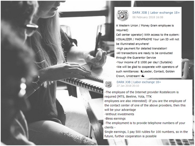 Autre exemple, une offre d’emploi accrocheuse recherche des employés de Western Union ou de MoneyGram qui ont accès à certains systèmes. Apparemment, ces employés se voient offrir jusqu’à 1 000 dollars par jour pour leurs efforts.